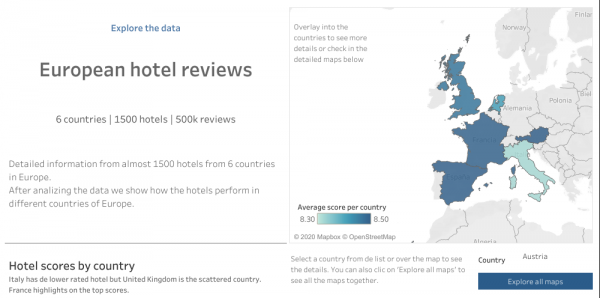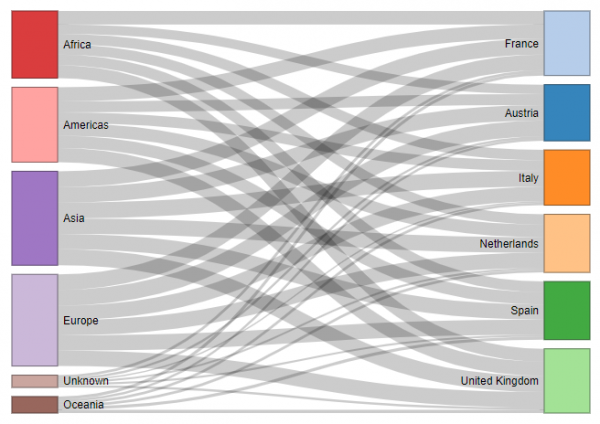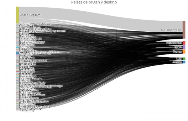 Debido a la gran variedad de países de origen no podemos ver demasiado a simple vista pero sí que podemos extraer alguna conclusión. Por ejemplo, a pesar de que United Kingdom tiene la mayoría de los hoteles, tiene turistas de 199 países por los 180 de Holanda y España o los 200 de Francia. Asimismo 170.000 de los 245.000 turistas de UK viajan dentro del país.
