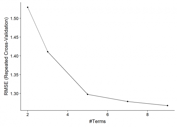 Aplicamos el modelo de regresión MARS con el método ‘earth’. Nuevamente, y tras diversas pruebas, detectamos que con los parámetros abajo indicados obtenemos un rendimiento aceptable y aumentando el numero de repeticiones no mejoramos el resultado.