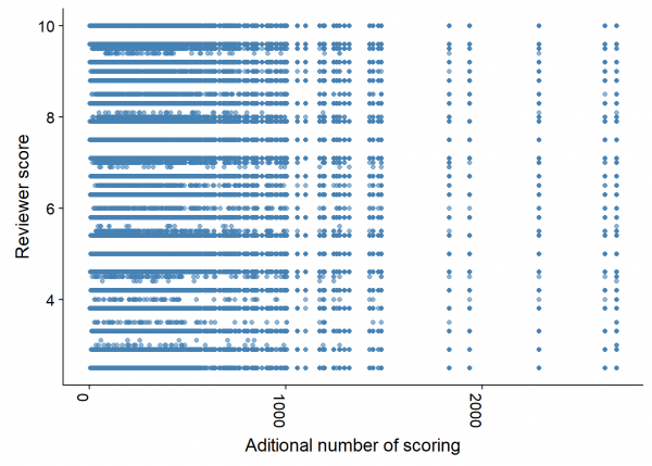 Otro dato que tenemos el el número de reviews que ha publicado un usuario. Nuevamente vemos si tiene relación con la puntuación otorgada:
