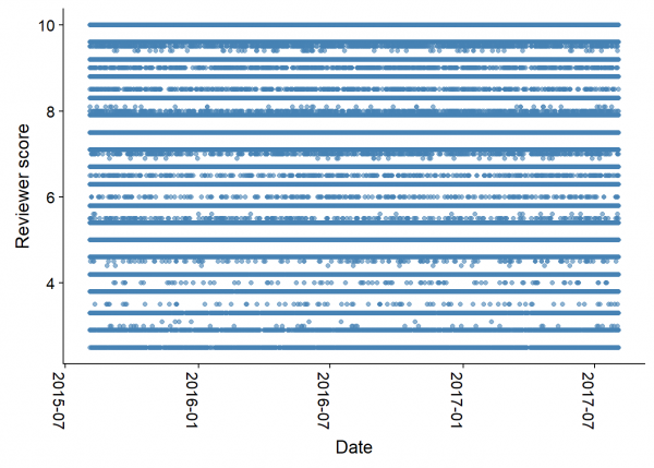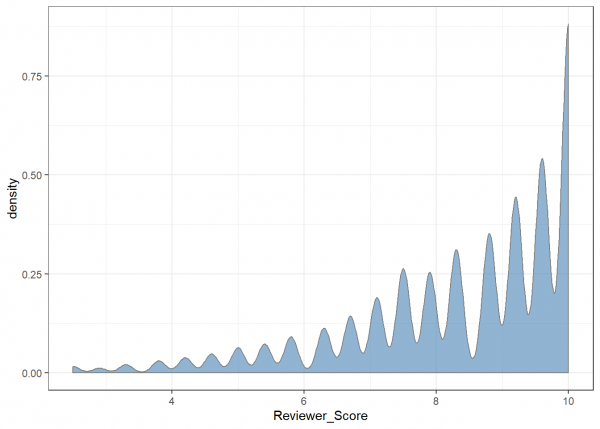 Vemos que la puntuación que más dan los clientes de de 10 y que la tendencia es clara hacia las puntuaciones altas. Vemos también que, en general, las puntuaciones fluctúan evitando los números redondos y que tienden hacia valores intermedios con decimales. Esto se puede deber a cómo se calculan las puntuaciones, ya que a veces es la media de varias puntuaciones a aspectos específicos. Curiosamente, esta norma se ‘rompe’ en el caso del 5, donde vemos que si que hay un repunte de puntuaciones.