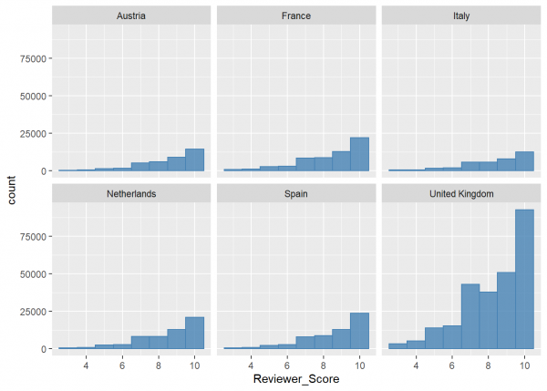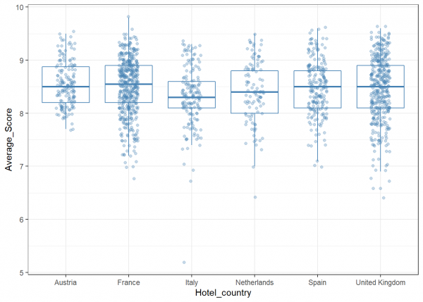 Vemos que la puntuación media está sobre 8.5 excepto Italia (veíamos al inicio que la media de este campo era de 8.4), que es un poco inferior. El hotel con la puntuación más alta está en Francia y la más baja en Italia. Descubrimos también que ningún hotel tiene una puntuación inferior a 5. El Reino Unido es el que tiene la mayor dispersión en las puntuaciones con bastantes hoteles con puntuaciones inferiores.