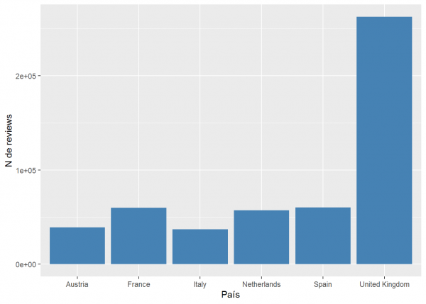 Vemos que Reino Unido también es el país del que tenemos más reviews, lo cual puede afectar a los resultados antes vistos ya que tiene más peso en los cálculos.