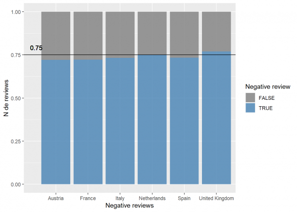 La media baja hasta el 75% de los clientes que deja comentarios negativos sobre su estancia. Reino Unido es el único destino que supera este umbral, seguido de Italia que está justo en la media.