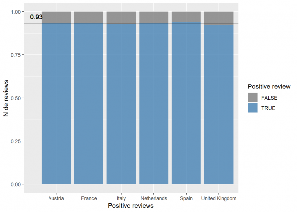 Vemos que el 93% de las reviews incluyen comentarios positivos sobre el hotel o la estancia. España es el país que destaca ligeramente, Italia se queda en la media y Reino Unido es el único país que baja la media.