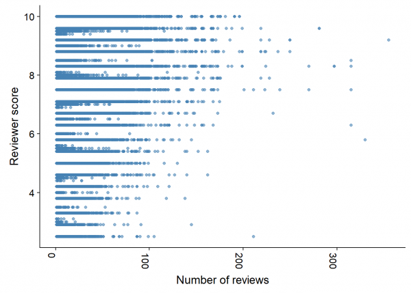 Nuevamente observamos cierta tendencia a que, a mayor número de reviews, más valoraciones positivas.