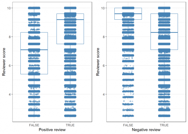 Efectivamente, las reviews que incluyen comentarios positivos tienden a puntuar más alto, mientras que las valoraciones con comentarios negativos puntúan más bajo. De hecho, vemos que la mayoría de reviews sin comentarios negativos se concentra en puntuaciones muy altas. Otros buen indicador para nuestro modelo.
