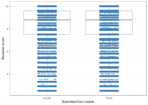 En este caso vemos que no hay ninguna relación entre la puntuación y si el comentario se realizó desde el móvil o no. Por lo tanto, podemos descartar esta variable de nuestro modelo.