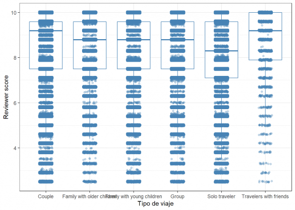 Aquí sí que vemos claramente que en los viajes con amigos la puntuación suele ser más alta mientras que los que viajan solos suelen ser los que más bajo puntúan. Las estancias de viajes en pareja también suelen recibir buenas puntuaciones.