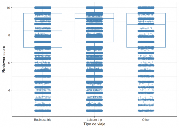 En este caso vemos pequeñas variaciones. Las puntuaciones en los viajes de placer suele ser superior a la de los viajes de trabajo.