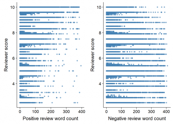 Vamos a analizar brevemente los comentarios que escriben los clientes sobre los hoteles. Tenemos los campos del recuento de palabras de los comentarios positivos y negativos. Vamos a enfrentarlos con las puntuaciones de los clientes: