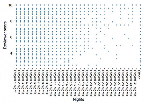 Como es lógico, en las estancias cortas las puntuaciones se reparten mucho pero sí que observamos que, a medida que el número de noches aumenta, las puntuaciones también lo hacen.