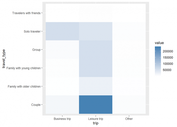 En este caso vemos que no tenemos ningún valor ‘Other’ lo cual significa que hemos extraído este tag para todos nuestros registros. 250.000 clientes viajaron en pareja y 100.000 lo hicieron solos, el resto se reparten entre familias, grupos y viajes con amigos.