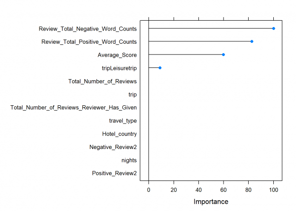 Caret nos indica el mejor modelo en función de las simulaciones calculadas. En este caso obtenemos un modelo que es capaz de predecir las puntuaciones de los clientes con una variación de un punto. Vemos también que el valor MAE de nuestro modelo final es menor, lo cual nos indica que predice bastante bien la mayoría de puntuaciones aunque en algunas puntuales la desviación sea mayor.